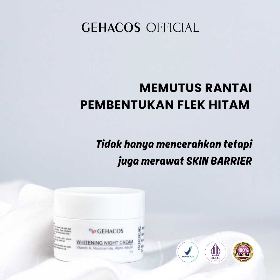 - Memilih GEHACOS Whitening Night Cream berarti memilih kualitas perawatan medis yang terjamin.