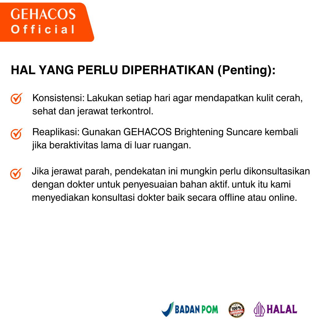 - Reaplikasi: Gunakan GEHACOS Brightening Suncare kembali jika beraktivitas lama di luar ruangan.