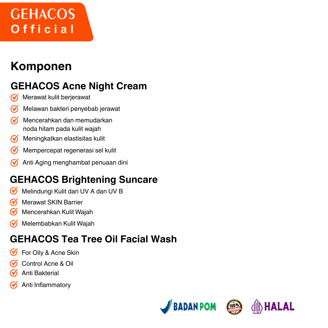 - GEHACOS Acne Night Cream untuk melawan bakteri penyebab jerawat, mempercepat regenerasi sel dan Anti Aging.